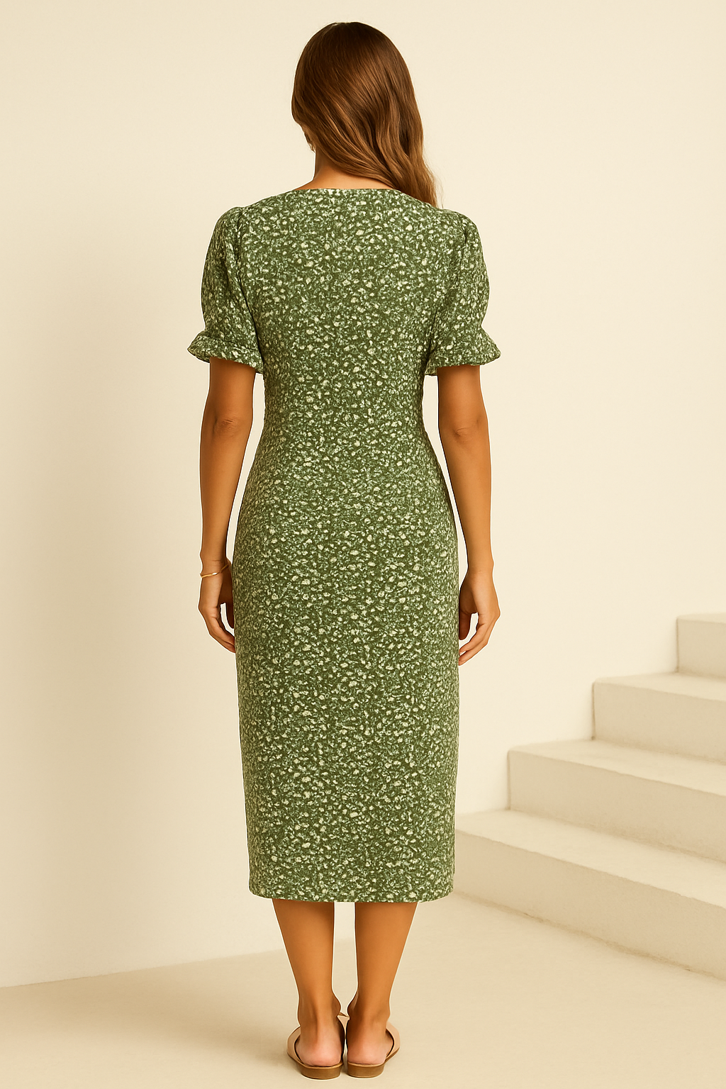 De korte mouwen met een lichte pof en het knoopdetail aan de zijkant geven de jurk een charmant, modern accent.