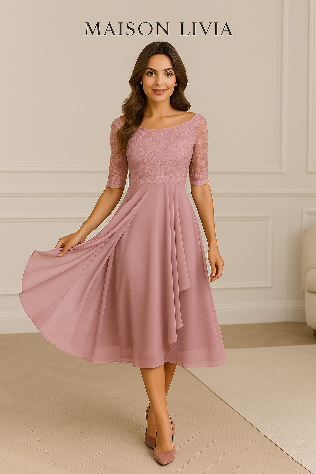 Met een delicate kantdetails aan de bovenkant en een vloeiende chiffonrok, straalt deze jurk tijdloze elegantie uit.